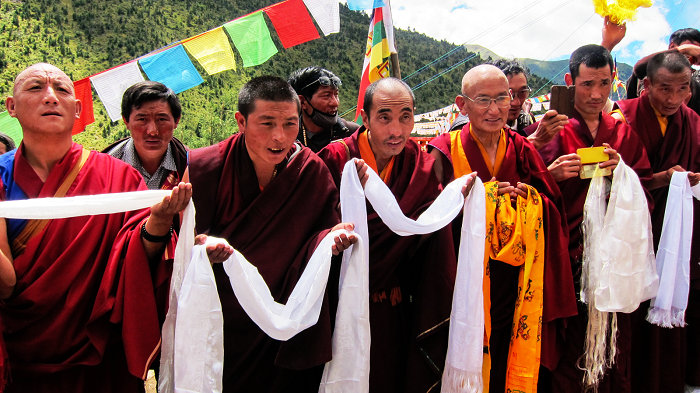 高僧大德们步入夏匝圣地 车队抵达主会场,“夏匝佛学院”法嗣·院长吉美旺修、副院长·堪布仁增旺嘉率领佛学院全体僧众带着哈达,对高僧大德们的莅临表示热烈的欢迎。 高僧大德们在开光典礼上