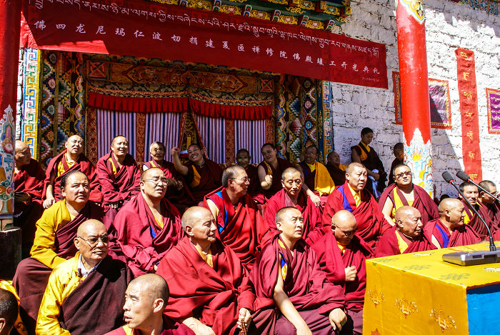 高僧大德们在开光典礼上 午后3:00,高僧大德们午饭小憩后。今天法会的主要内容——“琼阔活佛·四龙尼玛仁波切捐建夏匝禅修院佛殿竣工开光典礼”正式举行。 尼玛登孜堪布主持开光典礼